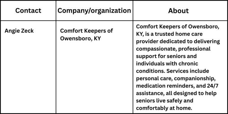 “Choosing care for a parent is an emotional decision. We speak with families daily who balance their own lives while wanting to protect their loved ones. Offering support at home brings comfort to seniors and peace of mind to the whole family,” said Angie Zeck, owner of Comfort Keepers of Owensboro, KY.